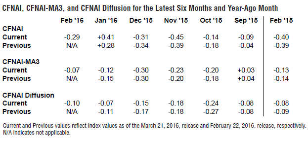 The Chicago Fed National Activity Index dropped lower than expected in February for reading of -0.29 percent from +0.41 percent in January. The reading of -0.29 indicates below average growth for the national economy.