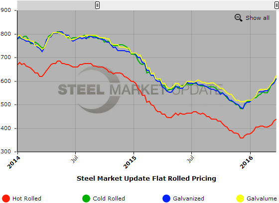 SMU Note: Below is a graphic showing our hot rolled, cold rolled, galvanized, and Galvalume price history. To use the graphs interactive capabilities, you must view it on our website here. If you need help navigating the website or need to know your login information, contact us at info@SteelMarketUpdate.com or by calling 800-432-3475.