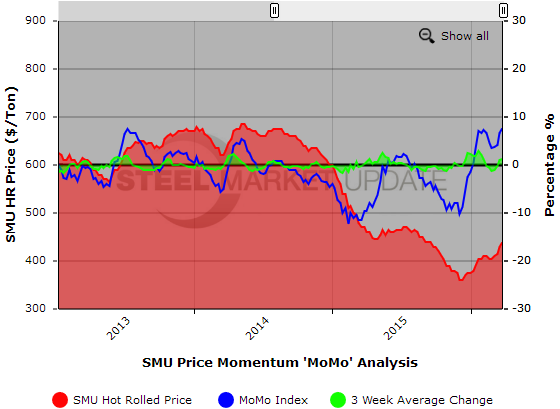 MoMo was measured at 7.65 percent this week, meaning that the current HRC price is higher than the average price over the last 12 weeks.