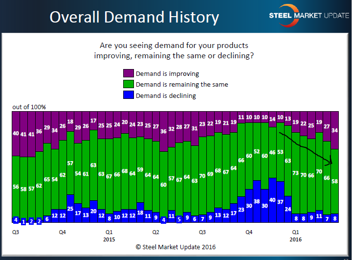 In our most recent flat rolled steel market analysis, we found an improving demand trend which helps explain our optimistic report regarding our Sentiment Index. The trend line shows demand as growing (see below) and is at its best level seen since very early in second quarter 2015 (when the trend reversed itself).