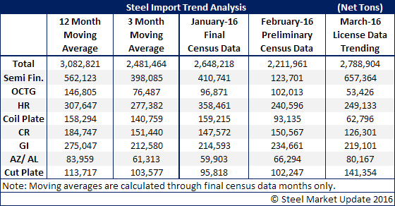 When looking at the import license data it is important to put the data into some sort of context. At this time, SMU expects March 2016 foreign steel imports to total 2.4-2.6 million tons. If correct, March foreign steel imports would be higher than the month of February Preliminary Census numbers by approximately 300,000 tons. Foreign steel imports totaled 3,615,960 net tons during March 2015.