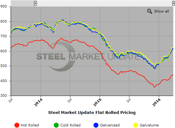 SMU Note: Below is a graphic showing our hot rolled, cold rolled, galvanized, and Galvalume price history. To use the graphs interactive capabilities, you must view it on our website here. If you need help navigating the website or need to know your login information, contact us at info@SteelMarketUpdate.com or by calling 800-432-3475.