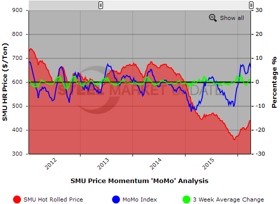 The graph below demonstrates the relationship between the SMU hot rolled coil price, the SMU Price MoMo Index, and the three week moving average change in the MoMo Index. As published in our Tuesday evening issue, the SMU HRC price range for this week is $420-$460 per ton with an average price of $440, unchanged from last week.