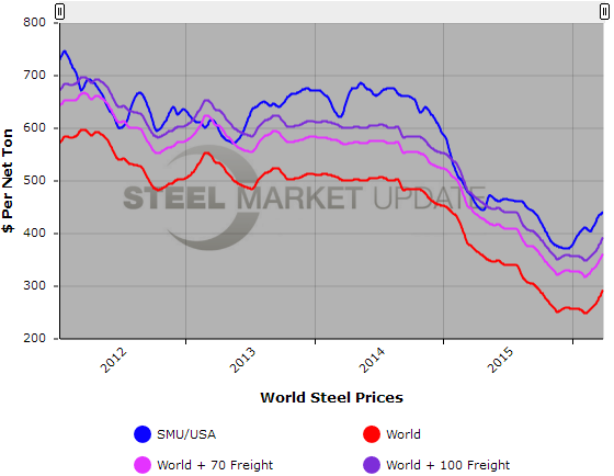 Below is a graph comparing world HR export prices against the SMU domestic HR average price. We also have included a comparison with freight and traders’ costs added which gives you a better indication of the true price spread. You will need to view the graph on our website to use it’s interactive features, you can do so by clicking here. If you need assistance with either logging in or navigating the website, please contact us at 800-432-3475 or info@SteelMarketUpdate.com.