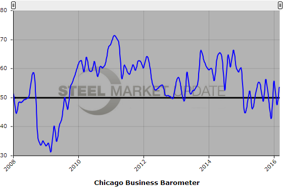 Below is a graph showing the history of the Chicago Business Barometer. You will need to view the graph on our website to use it’s interactive features, you can do so by clicking here. If you need assistance with either logging in or navigating the website, please contact our office at 800-432-3475 or info@SteelMarketUpdate.com.