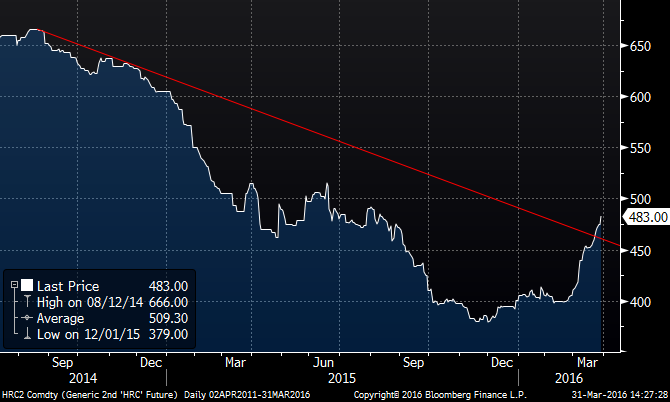 The rolling 2nd month HRC future is now up 27 percent from the low of $379/st on Dec. 1st, 2015. The downtrend has been breached!!