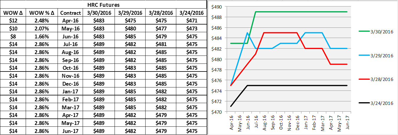 In the holiday shortened week, 29,780 short tons traded hands in the HRC futures markets. We saw trades all the way out to Q2 2017.* Last Thursday we saw trades at $475/st in June and Q316. Monday saw prices push higher as 500 tons of May traded $477 followed by 300 st/m of August and September at $485. Tuesday saw Q2 trade $480 and an awesome 3000st/m trade in Q3 at $482 (that’s 9000 tons!). Wednesday’s index print emboldened the bulls as Q2 and Q3 traded $489 and $490. A flat Q2 Q3 spread was traded. What that means is one participant bought Q2 and sold Q3 to the other side and there was no difference in price i.e. all tons were priced at $489. Thus the curve shifted from contango to flat. Next stop backwardation? Today’s trades included May, June, July and Aug. at $490/st, 1kst/m** of Q3 at $489 and 500 st/m of Q2 2017 at $490 st/m.