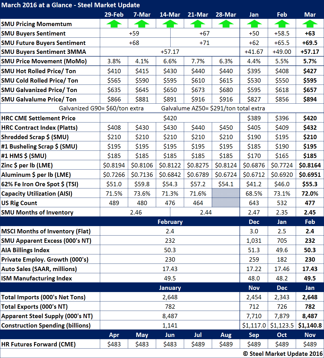 The higher prices and consistent price movement is helping guide our SMU Steel Buyers Sentiment Index to new higher levels (and close to record highs for our index). We like to watch our three month moving average (3MMA) which takes any wrinkles out of the data. Our 3MMA average for Sentiment jumped during the month of March from +49.0 in February to +57.17 by the end of March.