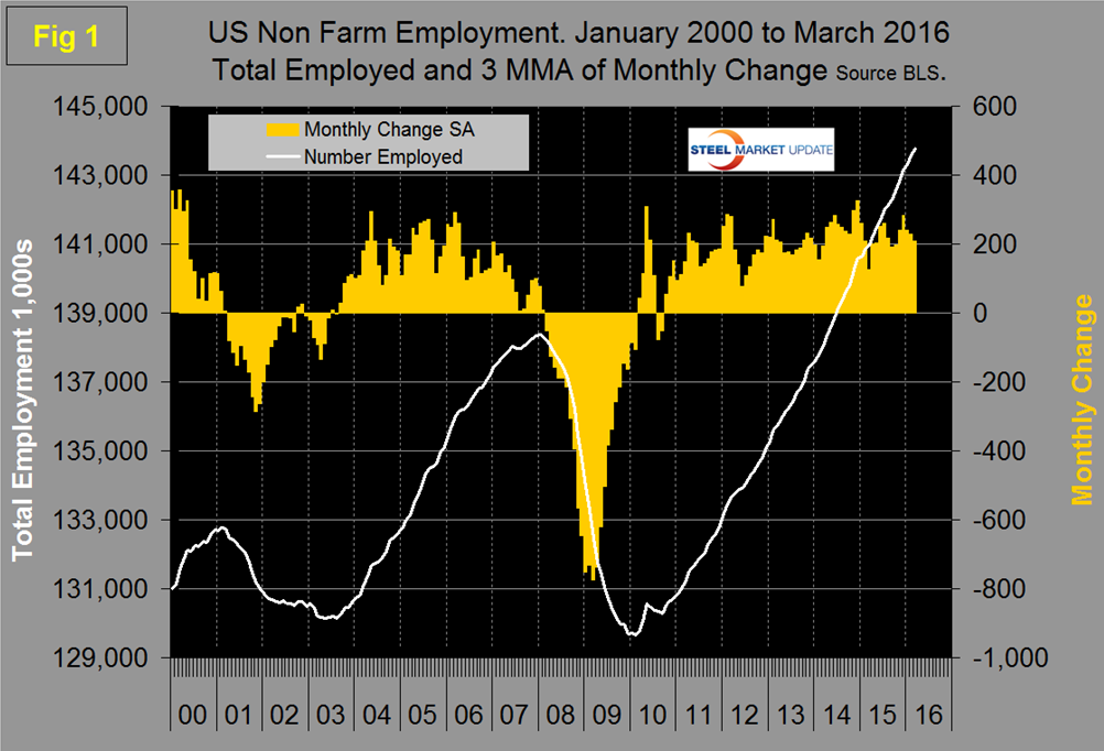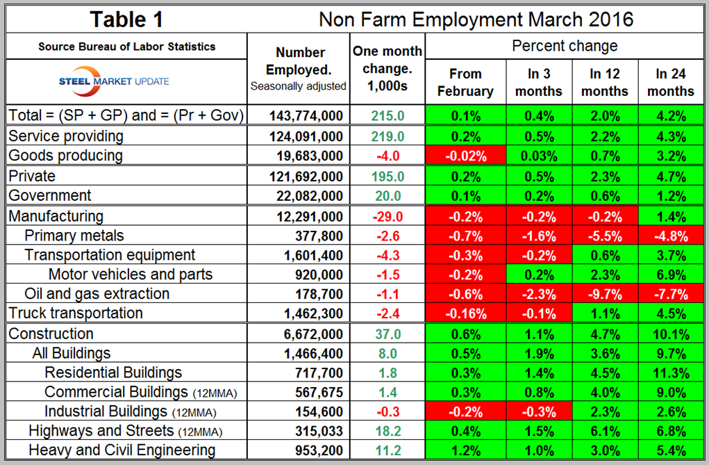 The bad news in March was that job creation in manufacturing industries was terrible and with a 29,000 loss which was the worst result since the recession. Manufacturing employment is now lower than in January last year. Table 1 shows that this poor performance was evident across all the sectors that we track including truck transportation. Primary metals is actually worse than oil and gas extraction across all the four time periods. Primary metals lost 2,600 jobs in March and that sector is down by 5.5 percent in 12 months. Motor vehicles and parts lost 1,500 jobs in March, oil and gas extraction lost 1,100 and truck transportation lost 2,400. Note the subcomponents of both manufacturing and construction shown in Table 1 don’t add up to the total because we have only included those that have most relevance to the steel industry. Construction has leapt ahead of manufacturing as a job creator but it must be recognized that productivity increases in manufacturing are very much greater than they are in construction. On the same day (April 1st) that this jobs data was released, the ISM released its manufacturing update. The ISM report was excellent and returned to expansion for the first time since August last year. What gives you are thinking! The interesting thing is that in the ISM report every sub-component improved except employment which deteriorated. The implication is that productivity is in fact playing a part in the dismal manufacturing employment result.
