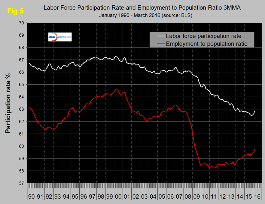 The employment participation rate is widely quoted in the press as going nowhere. In March 2016 the rate was 63.0 percent which was the same as January 2014. We’re not sure that we understand what this is a percentage “of” because of the multiple descriptions of the labor pool. Another measure is the number employed as a percentage of the population which we think is much more definitive. In March this measure stood at 59.9 percent which was up from 58.8 percent in January 2014. Figure 5 shows both measures on one graph.