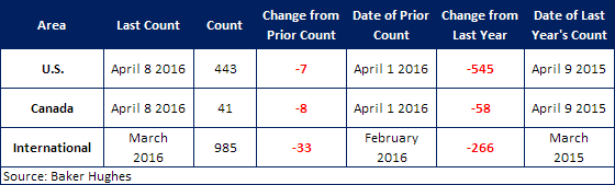 According to Baker Hughes data from April 8, 2016, the U.S rig count for the week was 443 rigs exploring for or developing oil or natural gas. This is a decrease of 7 rigs when compared to last week, with oil rigs down 8 to 354 rigs, gas rigs up 1 to 89 rigs, and miscellaneous rigs unchanged at 0 rigs. Compared to this time last year, the 443 count is down 545 rigs, with oil rigs down 406, gas rigs down 136, and miscellaneous rigs down 2.