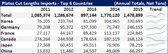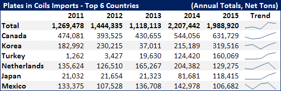 We took a look at plate imports over the past few years to see what countries might be involved. When dealing with plate you have both plate in coils as well as cut to length plate to consider. We are showing the top five or six exporting countries for each (coil & cut to length) for your review.