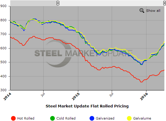 SMU Note: Below is a graphic showing our hot rolled, cold rolled, galvanized, and Galvalume price history. To use the graphs interactive capabilities, you must view it on our website here. If you need help navigating the website or need to know your login information, contact us at info@SteelMarketUpdate.com or by calling 800-432-3475.