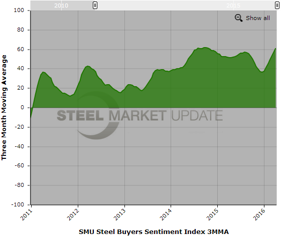 Based on our analysis of the most recent flat rolled steel market trends survey conducted by Steel Market Update this week, we continue to find buyers and sellers of steel being very optimistic. The current market index improved to +70 which is the highest (most optimistic) number ever recorded by our Sentiment Index going back to its beginning in late 2008. We believe buyers and sellers are responding to improving pricing fundamentals increasing the value of inventories and making it easier to be successful in the spot markets.