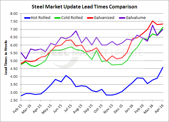 The average lead time for cold rolled was 7.12 weeks, up from 6.60 in mid-March. One year ago lead times were 4.82 weeks.