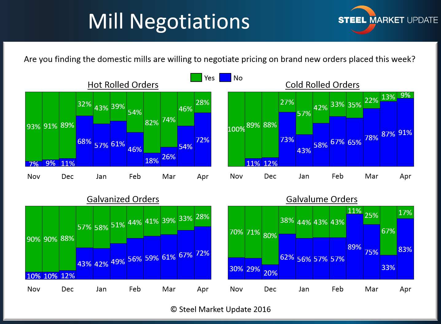 You can clearly see the trend for negotiations between the domestic steel mills and their customers based on the results of this weeks flat rolled steel market trends analysis.