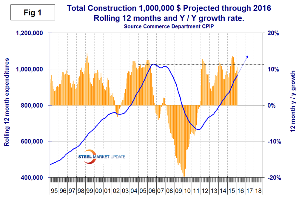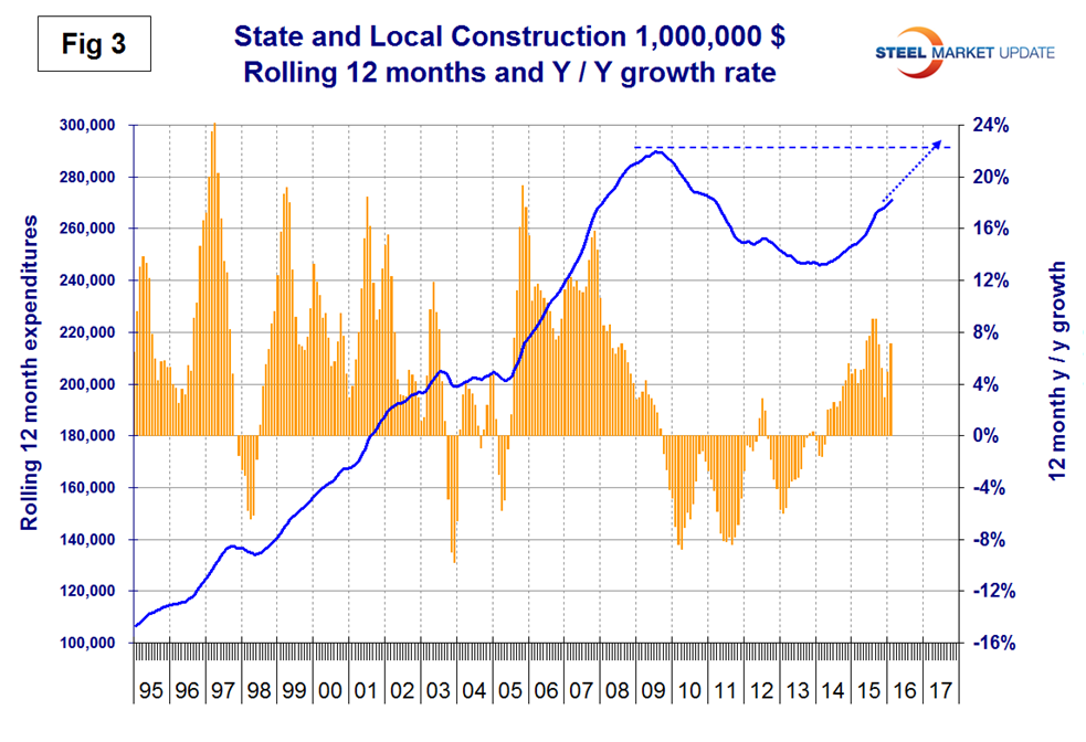 The 10.4 percent growth of total construction y/y was led by private work up by 11.9 percent. State and locally financed work was up by 7.1 percent and Federal by 1.0 percent. Momentum was negative for private and federal work but positive for state and local. Building construction had negative momentum but infrastructure, industrial, utilities and power accelerated. We consider four sectors within total construction. These are non-residential, residential, infrastructure and other. The growth rate of non-residential buildings and residential buildings is good and infrastructure had the best growth rate in five months. The growth rate of “Other” became very negative at the time of the oil price collapse but has recovered to positive growth in the last six months on a 3MMA basis. The growth rate of total construction is shown by the brown bars in Figure 1. The pre-recession peak of total construction on a rolling 12 month basis was $1,145 B in 12 months through February 2007. The low point was $665.1 B in 12 months through October 2011. The 12 month total through the latest data of February 2016 was $964.9 B. July through February were the first months to exceed $900 B since April 2009 when the recession was gaining traction.