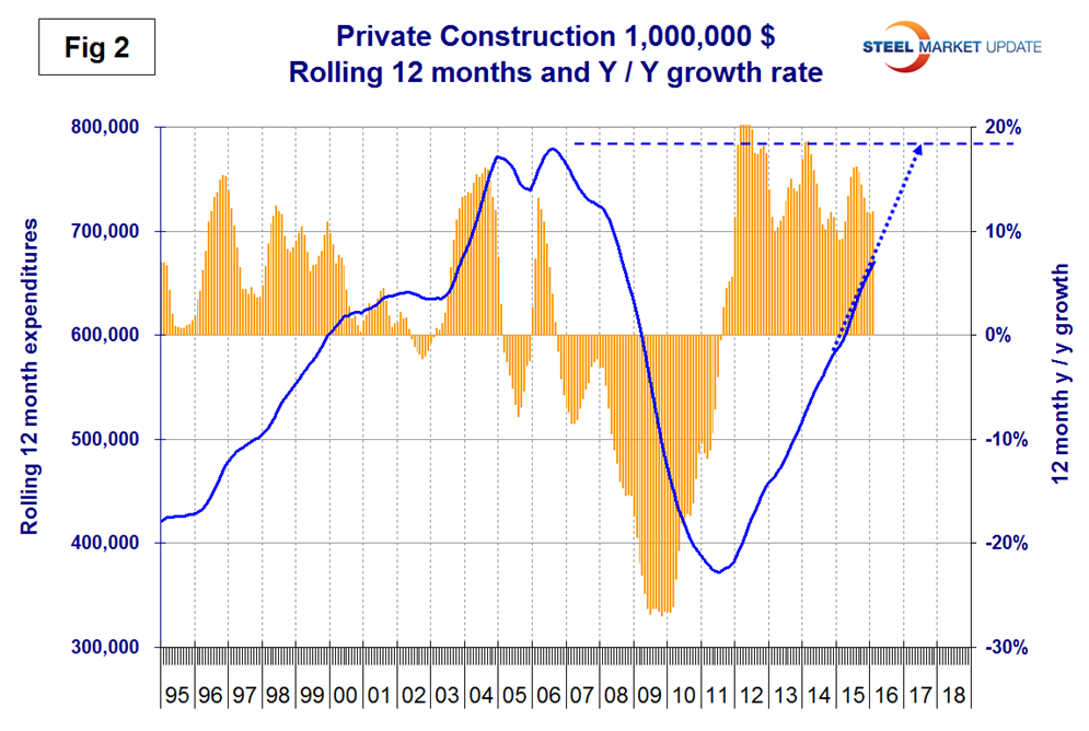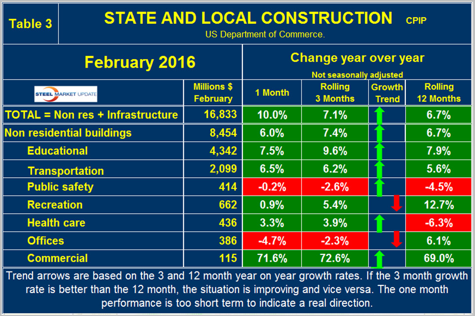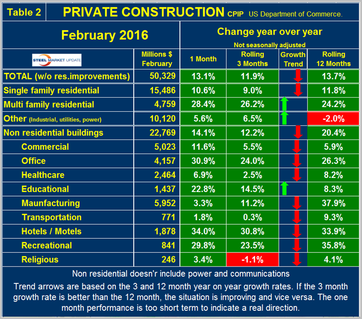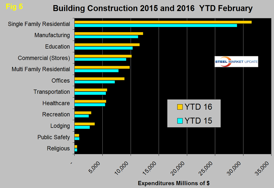 Single family residential is dominant and in February 2016 totaled $15.5 billion. Encouraging for steel people is that so far this year, the manufacturing sector has had the highest construction expenditures of all the non-residential sectors. On this year over year basis the only sector to be trailing 2015 was public safety which was down by 3.4 percent, at the other extreme lodging (hotels and motels) were up by 33.6 percent followed by multi-family residential buildings up 25.5 percent and offices up by 24.2 percent.