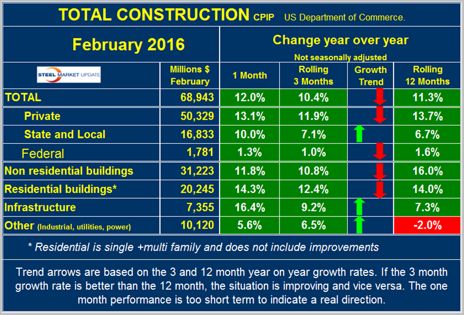 Explanation: The official CPIP press report gives no appreciation of trends on a historical basis and merely compares the current month with the previous one on a seasonally adjusted basis. The data is provided as both seasonally adjusted and non-adjusted. The detail is hidden in the published tables which we at SMU track and dissect to provide a long term perspective. Our intent is to provide a rout map for those subscribers who are dependent on this industry to “Follow the money.” This is a very broad and complex subject therefore to make this monthly write up more comprehensible we are keeping the information format as consistent as possible. In our opinion the absolute value of the dollar expenditures presented are of little interest. What we are after is the magnitude of growth or contraction of the various sectors. Data is reported by the Commerce Department on both a seasonally adjusted and non-adjusted basis. Their official commentary is based on adjusted numbers. In the SMU analysis we consider only the non-seasonally adjusted data because we don’t trust seasonal adjustments and in any case our businesses operate in a seasonal world. We eliminate seasonal effects by comparing rolling three month expenditures year over year. CPIP data also includes the category of residential improvements which we have removed from our analysis in the rational that such expenditures are minor consumers of steel.