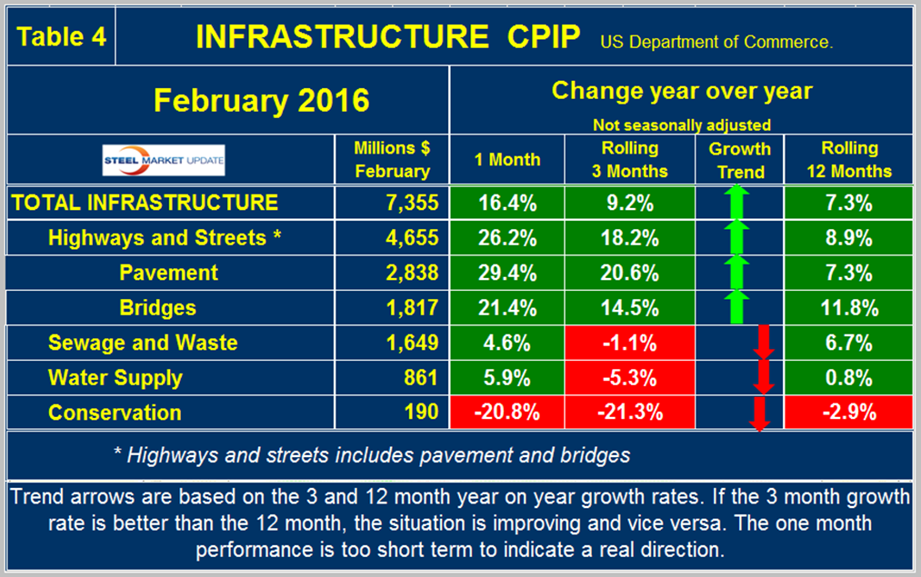 Expenditures have had positive growth every month since July 2013 but growth slowed each month from August through December. In January there was a recovery to 3.3 percent which continued into February when y/y growth was 9.2 percent. Highway and streets including pavement and bridges accounts for about 2/3 of total infrastructure expenditures and had positive growth every month since April 2015 culminating in an 18.2 percent rate in three months through February. This was the highest growth rate since July 2006. Highway pavement is the main sub-component of highways and streets and had a 20.6 percent positive growth in three months through February. Bridge work has had positive growth for each of the last 15 months. Bridge work totaled $1.8 billion in the single month of February with a 14.5 percent growth rate (Table 4).