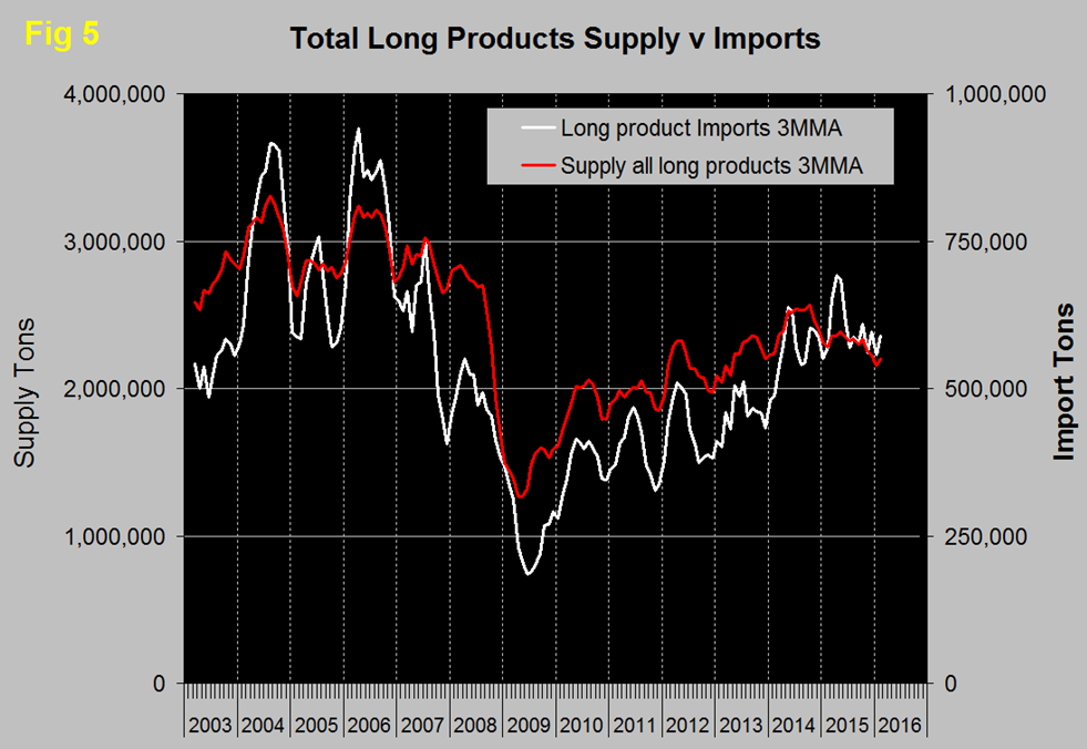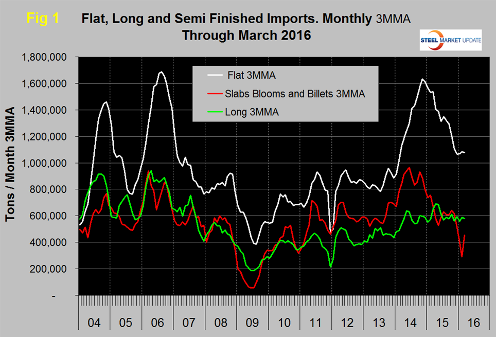 Flat includes all hot and cold rolled sheet and strip plus all coated sheet products plus both discrete and coiled plate. The 3MMA of flat rolled imports peaked at 1,634,000 tons in November 2014 and at 1,078,045 tons in March 2016 has been <1.1 million tons for four consecutive months. Long product imports have been stuck in the range 519,000 tons to 772,000 tons since March 2014 with no particular trend evident. In March the 3MMA of long product imports was 581,523 tons.