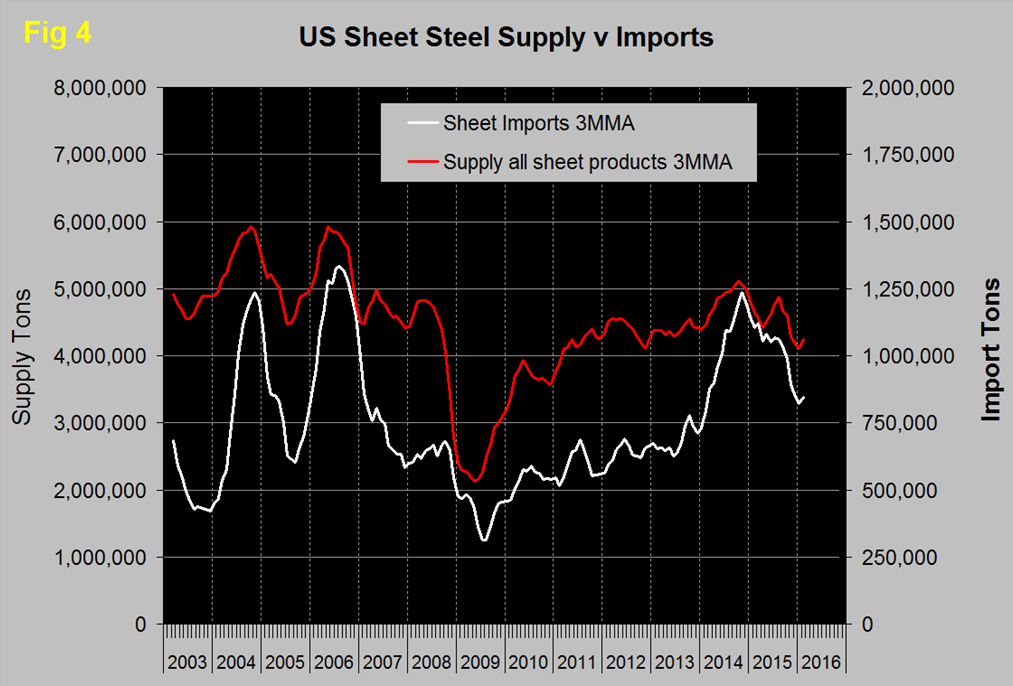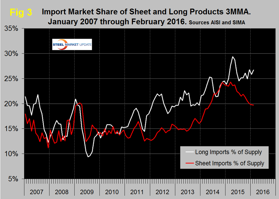 Figure 3 shows the import market share of sheet and long products through February which is the latest data available for total steel supply.