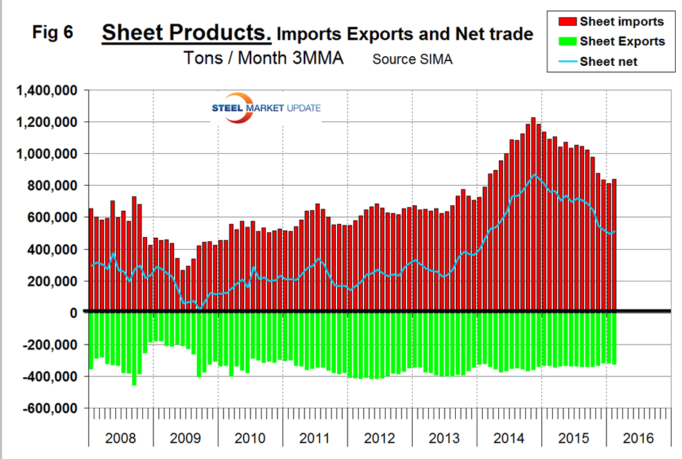 Net imports equals imports minus exports and our analysis is based on the final volumes through January. We regard this as an important look at the overall trade picture and its effect on demand at the mill level. Figure 6 shows that net sheet product imports on a 3MMA basis at 512,066 tons in February were down by 248,000 tons year over year.