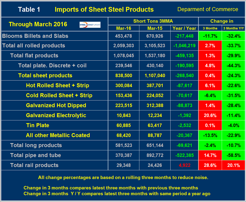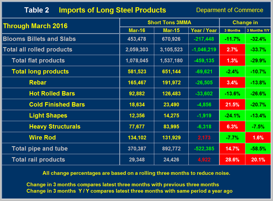 It compares the average monthly tonnage in the latest three months through March with both three months through December (3M/3M) and three months through March 2015 (Y/Y). On a Y/Y basis the total of all rolled products was down by 33.7 percent, as total sheet products were down by 24.3 percent. Tubulars were down by 58.5 percent. Semi-finished slabs, blooms and billets were down by 32.4 percent and long products were down by 10.7 percent. There was an increase in many categories on a 3M/3M basis as indicated by the color code red. Hot rolled was up by 6.1 percent as cold rolled declined by 6.4 percent. The total volume of hot worked products was down by over a million tons from March 2015. These trends indicate that in the big picture the overall volume of imports is falling fast but in the first quarter there was a small reversal compared to Q4 last year. The color codes in Tables 1 and 2 for the three month and year over year change show which products are improving and which have still experienced import volume increases in these two time frames.