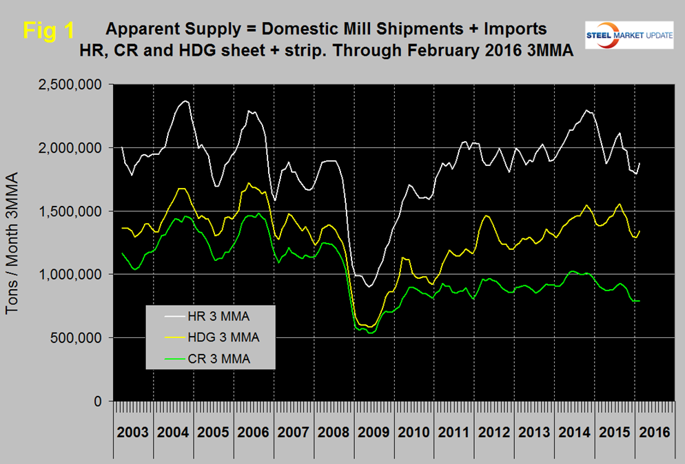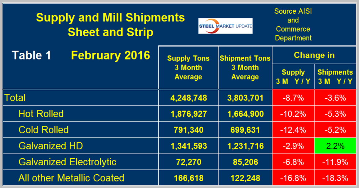 Table 1 shows both supply and mill shipments of sheet products (shipments includes exports) side by side as a three month average through February, for both 2015 and 2016.