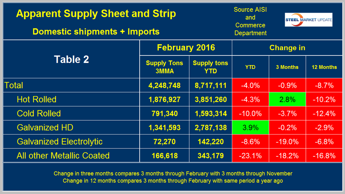 Apparent Supply is a proxy for market demand and is defined as domestic mill shipments to domestic locations plus imports. In three months through February 2016 the average monthly supply of sheet and strip was 4.2 million tons, down by 8.7 percent year over year as mentioned above. In the three months through February supply was down by 0.9 percent compared to the period September through November. The short term decline (3 months) is less than the long term (12 months) which means that the decline is slowing. Table 2 shows the change in supply by product on this basis through February.