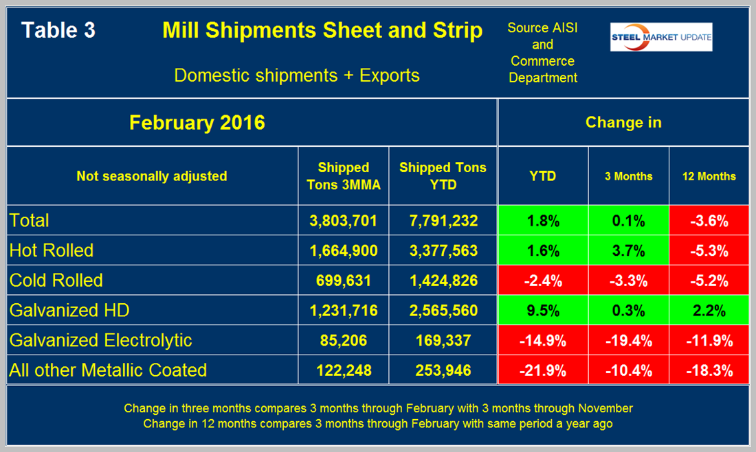 Table 3 shows that total shipments of sheet and strip products including hot rolled, cold rolled and all coated products were down by 3.6 percent in 3 months through February year over year and up by 0.1 percent comparing three months through February with three months through November.