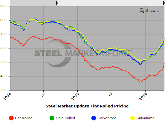 SMU Note: Below is a graphic showing our hot rolled, cold rolled, galvanized, and Galvalume price history. To use the graphs interactive capabilities, you must view it on our website here. If you need help navigating the website or need to know your login information, contact us at info@SteelMarketUpdate.com or by calling 800-432-3475.