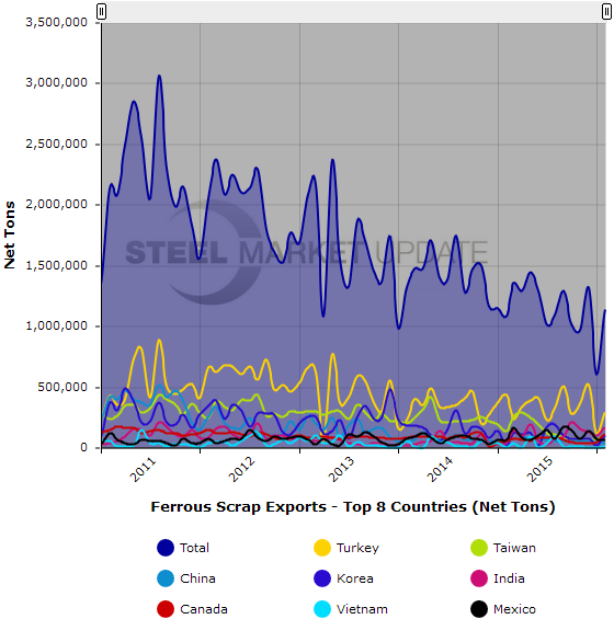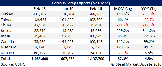 The most significant change month over month went to Turkey, which jumped up 172,664 tons or 148.6 percent from January to February (following a 394,301 ton decrease from December to January). Other significant changes include a 83,008 ton increase in scrap exports coming from Korea, a 63,654 ton increase from India, and a 63,319 ton increase in exports from Canada.