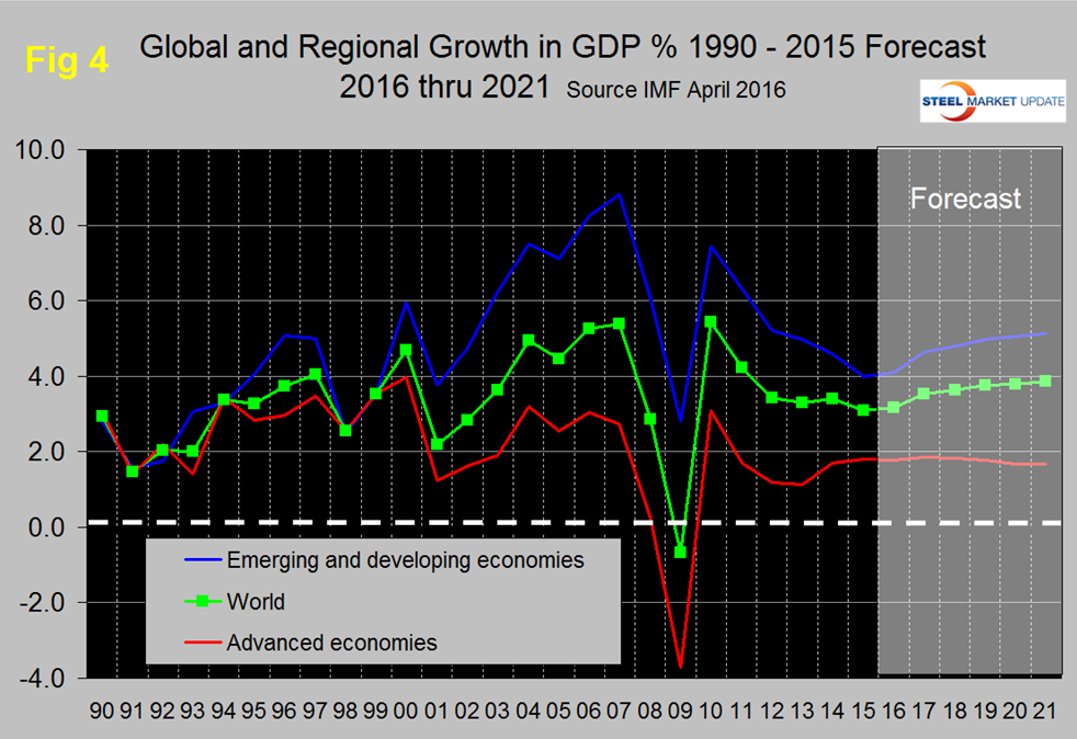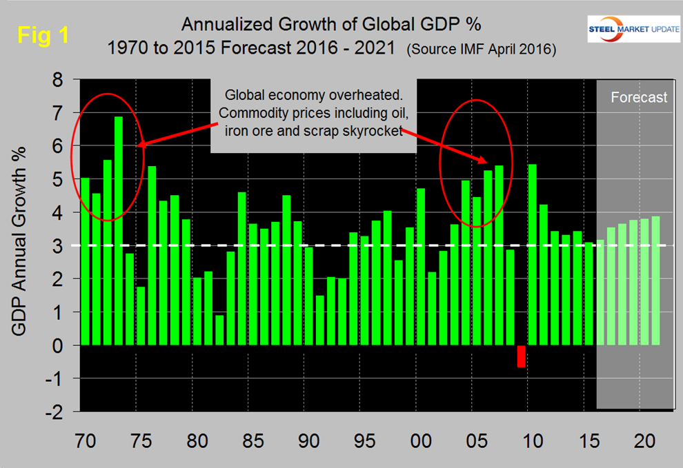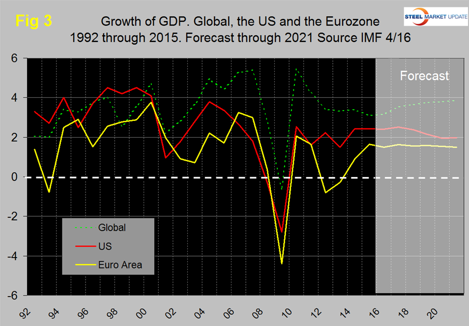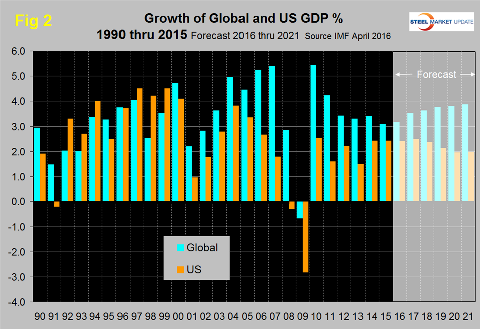 This is a long term average over a period of 65 years and based on the added volatility of steel can be a predictor of the immediate future. For example after the disastrous decline in steel demand in 2009 there was no doubt that a huge cyclical rebound would occur as inventory managers throughout the world began to react to the economic recovery. If the IMF forecast proves to be correct then the growth in steel demand will improve to around 3 percent by 2017. This is much better than current World Steel Association data through February. Later this month the WSA will release its updated short range forecast for 2016 and 2017. In the US steel market it requires about 2 percent growth in GDP to generate growth in steel demand therefore again if current forecasts prove to be correct regarding the US economy we can expect steel demand to expand through 2018 then tail off as we approach 2021.