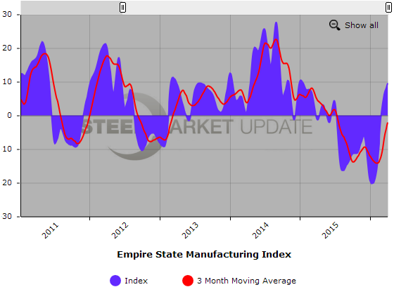 Below is a graph showing the history of the Empire State Manufacturing Index. You will need to view the graph on our website to use it’s interactive features, you can do so by clicking here. If you need assistance with either logging in or navigating the website, please contact our office at 800-432-3475 or info@SteelMarketUpdate.com.