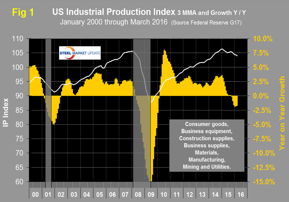 On a three month moving average (3MMA) basis, growth year over year has been negative for the last six months. October last year was the first negative growth month since February 2010. The March y/y decline was 1.70% (Figure 1). Data is seasonally adjusted and the index is based on the May 2012 level being defined as 100. Recessions are highlighted. The effect of the revisions has been to reduce the growth rate since the beginning of 2014. Before that the revisions didn’t make much difference.