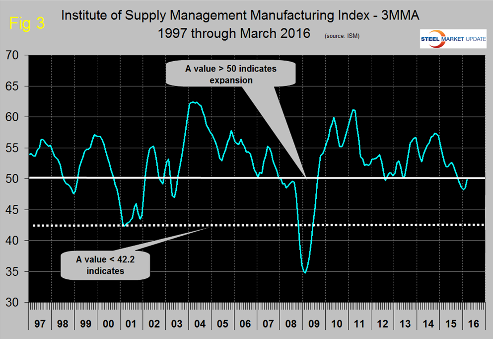 SMU Comment: We are getting mixed signals about the state of the manufacturing sector. Employment growth is dismal and this IP report says the sector is in contraction mode. The ISM manufacturing index surged in March to 51.8, its highest level since July last year. Figure 3 shows the 3MMA of the ISM manufacturing index since March 1997. Any value >50 indicates expansion. At SMU we try to examine two or three measures of the same activity as a reality check and on this basis we have to say that the jury is out when it comes to the direction of manufacturing. In March employment was down, the IP index was also down but the ISM index improved. Stay tuned!