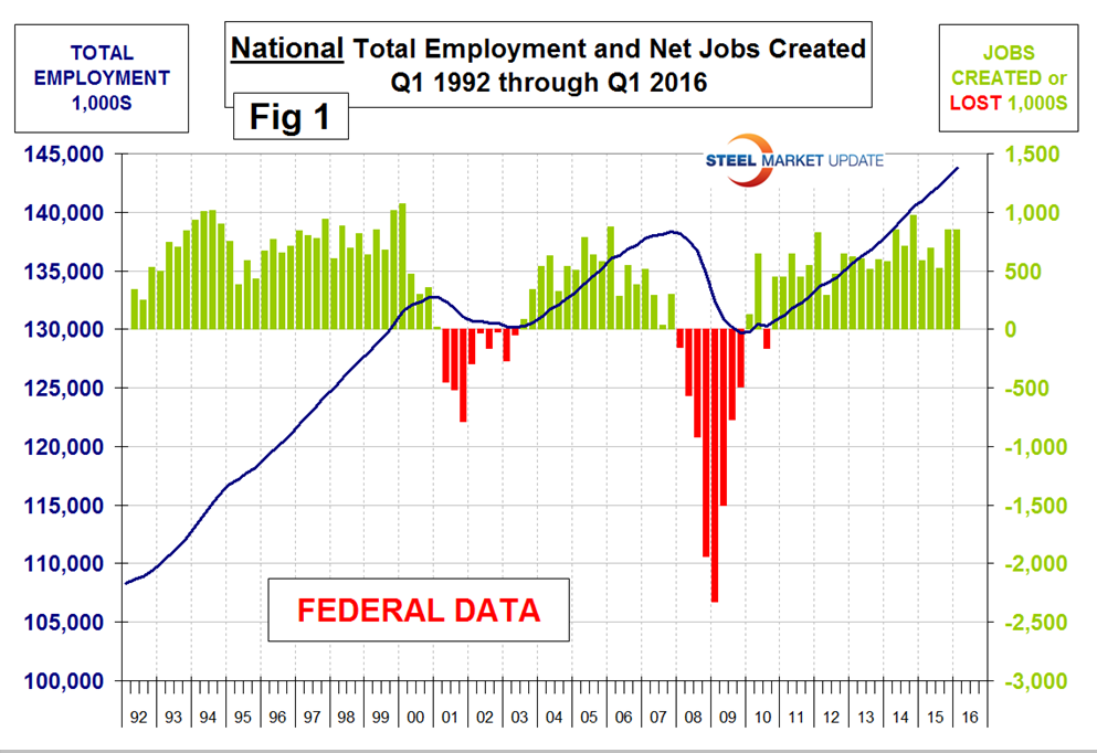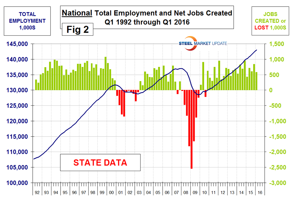 The states compile their employment numbers independently of the Feds, then both are reported by the Bureau of Labor Statistics. The results are close. In the last thirteen quarters since Q1 2013, the Feds reported total job creation of 8,948,000 and the states reported 8,610,400. There is a difference in these reports that shrinks the small discrepancy. The Feds capture off shore military personnel but the states don’t. Figures 1 and 2 show the history of Federal and State totals since 1992. SMU has graphs in the same format for 10 geographic regions and can produce for individual states if a reader so requests.