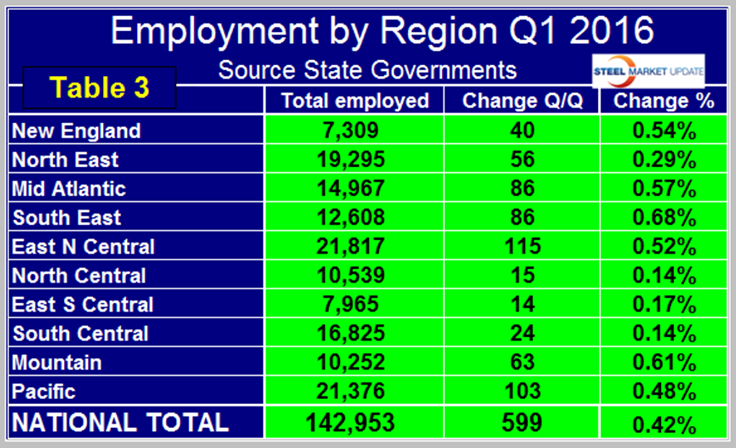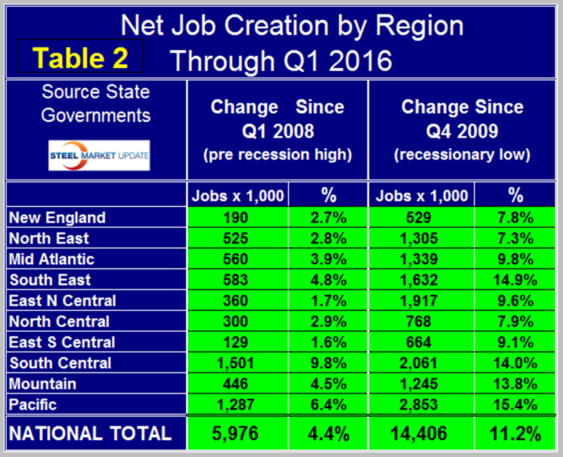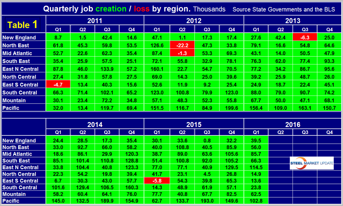 Table 1 shows the history of quarterly job creation by region for the last 5 years. All regions had positive job creation in each of the last four quarters. Problems in the oil and gas industries are evident in these regional employment reports. The South Central region went off a cliff in Q1 2015 after having the highest job creation of any region in the previous quarter. This region rebounded in Q2 through Q4 2015 but is nowhere near where it was before the oil price collapse. In the five quarters since Q4 2014, North Dakota has lost 20,700 jobs, Oklahoma has lost 6,100 jobs but Texas has gained 185,000 jobs. The East North Central region created the most jobs in Q1 of this year followed by the Pacific region. The only region to have had a losing quarter in the last five was the East South Central in Q1 2015.
