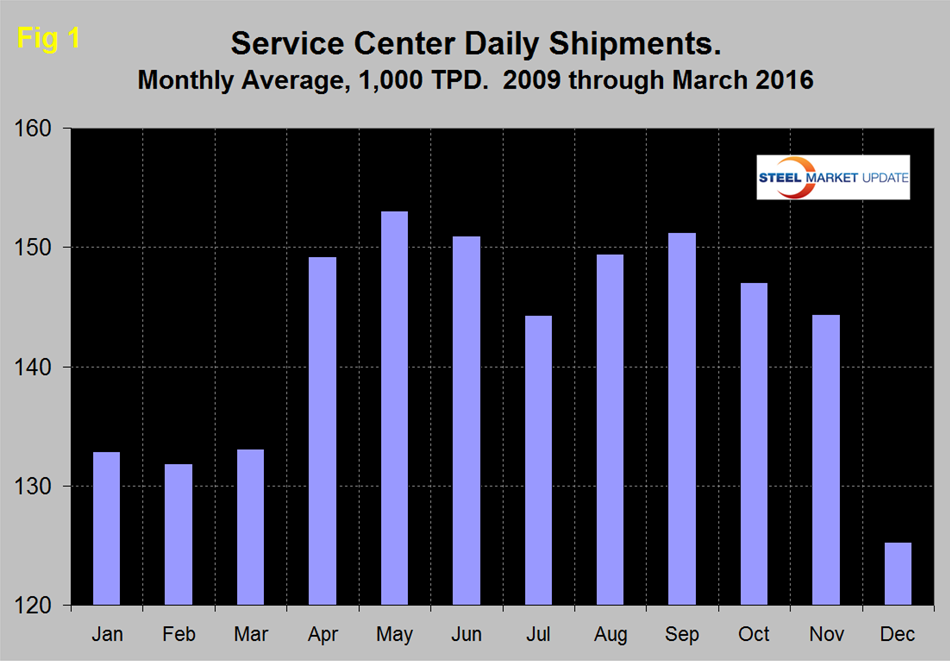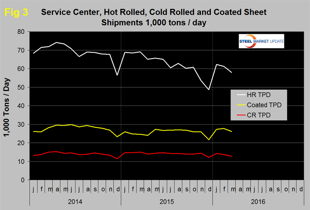 Total service center carbon steel shipments increased by 142,100 tons in March to 3.176 million tons. This increase was driven by the number of shipping days, up by 2 to 23. On a tons per day basis shipments decreased from 145,500 tons in February to 138,100 tons in March.