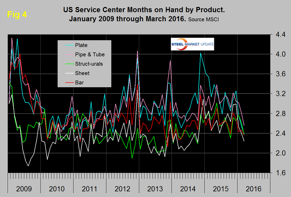 March closed with months on hand (MoH) of 2.29, down from 2.45 at the end of February. All products except coated sheet had a double digit y/y decrease in MoH and plate was down by 39.8%. Figure 4 shows the MoH by product monthly since January 2009. Pipe and tube currently has the highest months on hand. There continues to be a wide difference between the performances of flat rolled (sheet + plate) and long products (structurals + bar) at the service center level.