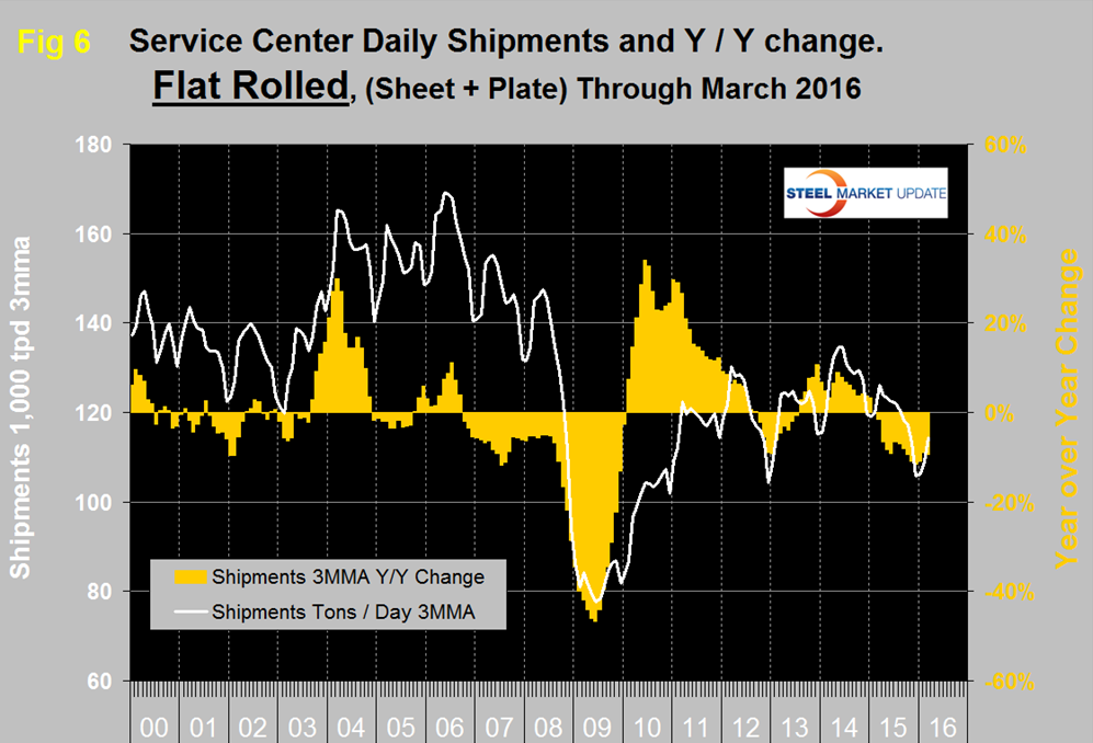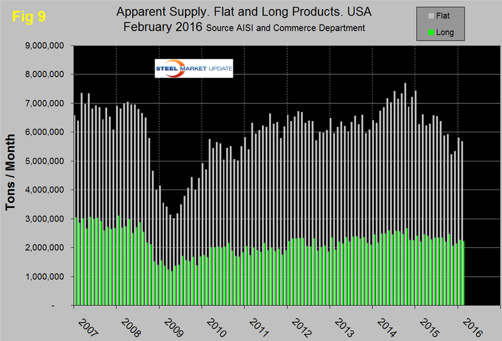 SMU Comment: In Figures 2, 5, 6 and 8, the white lines show tons per day shipments. There was a distinct decline in shipments for all major product groups (sheet products combined) in 2015 and on a y/y basis there is no light at the end of this tunnel. Figure 9 shows the total supply to the market of long and flat products based on AISI shipment and import data.