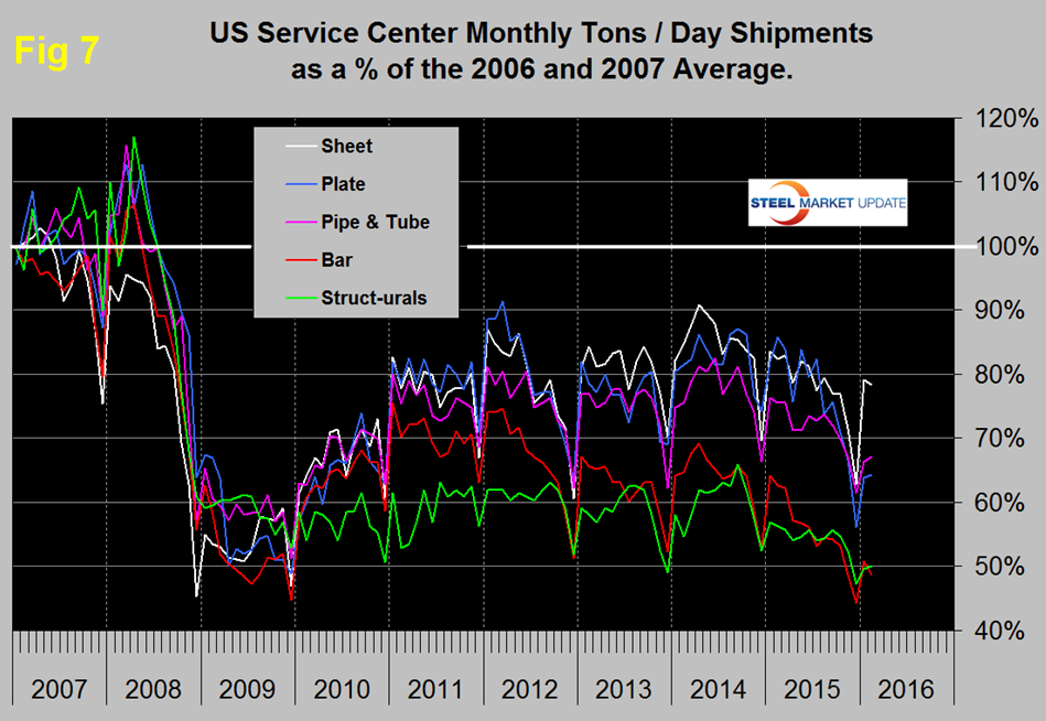In 2006 and 2007, the mills and service centers were operating at maximum capacity. Figure 7 takes the shipments by product since that time frame and indexes them to the average for 2006 and 2007 in order to measure the extent to which service center shipments of each product have recovered. All products experienced the normal January pick up and as described above bars and structurals have the worst record of recovery. Sheet had a strong upward kick in January with a give back in March. The total of carbon steel products is now at 65.0% of the shipping rate that existed in 2006 and 2007, with structurals and bar at 50.1% and 47.8% respectively. Sheet is at 74.0%, plate at 63.3% and tubulars at 66.4%.