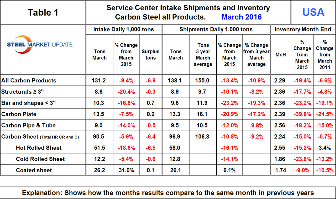 Table 1 shows the performance by product in March compared to the same month last year and also with the average t/d shipments for March during the last three years. We then calculate the percentage change between March 2016 and March 2015 and with the 3 year March average. Our intention is to provide an undistorted view of market direction. In March, intake at 131,200 t/d was 6,900 tons less than shipments. This was the sixth month of deficit after three months of surplus. The intake deficit was evident for all sheet products except coated. Plate and bar sized shapes had a small surplus of intake / shipments. Compared to March 2015, intake was down by 9.4% overall and the intake of all products except coated sheet was down y/y.