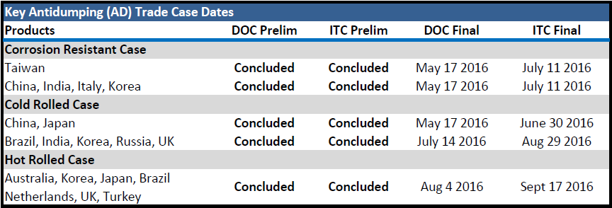 The following is a quick update on the status of the flat rolled trade cases (hot rolled, cold rolled and corrosion resistant) and what are the next important dates to remember. The corrosion resistant, which covers galvanized, Galvalume and related products such as galvanneal and aluminized, are scheduled to have the Final Determination by the US Department of Commerce voted on May 16 with the release to the public the following day, May 17th.