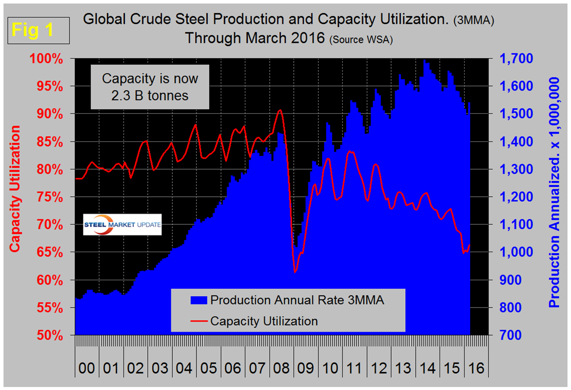 What actually happened was that the start of year surge was delayed as January and February expanded by less than normal. In the first quarter daily production grew by 8.8 percent this year compared to an eight year average of 9.7 percent. As production has increased each year since the recession, capacity utilization has decreased, the gap is widening. Capacity utilization in three months through March was 66.3 percent, down from 72.3 percent in three months through June. China accounted for 51.4 percent of global production in March, up from 48.6 percent in February. Asia as a whole, including India, accounted for 69.2 percent in March. China continues to state that redundant capacity will be closed and that the central government will provide support in the form of funding for re-assigned workers and for asset write-offs. If the WSA is keeping up with the situation, which we assume they are, then no actual capacity has been shuttered or if it has then new capacity has replaced it.