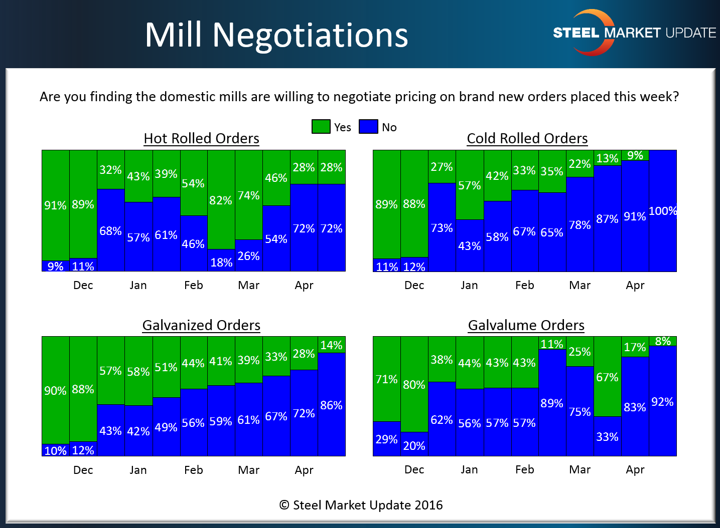 A side note: The data for both lead times and negotiations comes from only service center and manufacturer respondents. We do not include commentary from the steel mills, trading companies or toll processors in this particular group of questions.