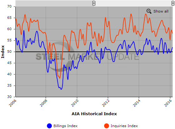 Below is a graph showing the history of the Architecture Billings Index and Inquiries Index. You will need to view the graph on our website to use it’s interactive features, you can do so by clicking here. If you need assistance with either logging in or navigating the website, please contact our office at 800-432-3475 or info@SteelMarketUpdate.com.