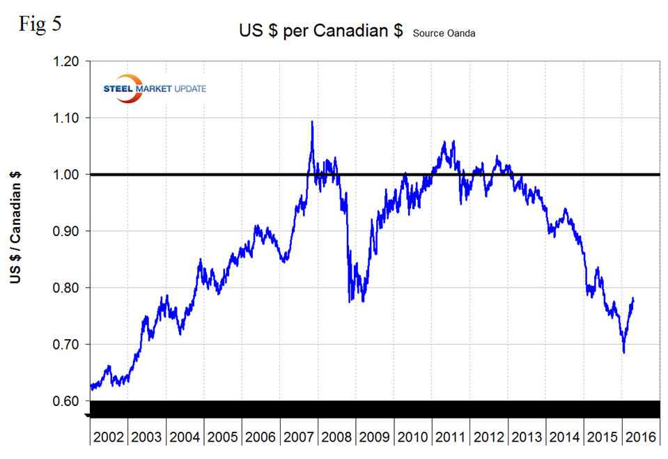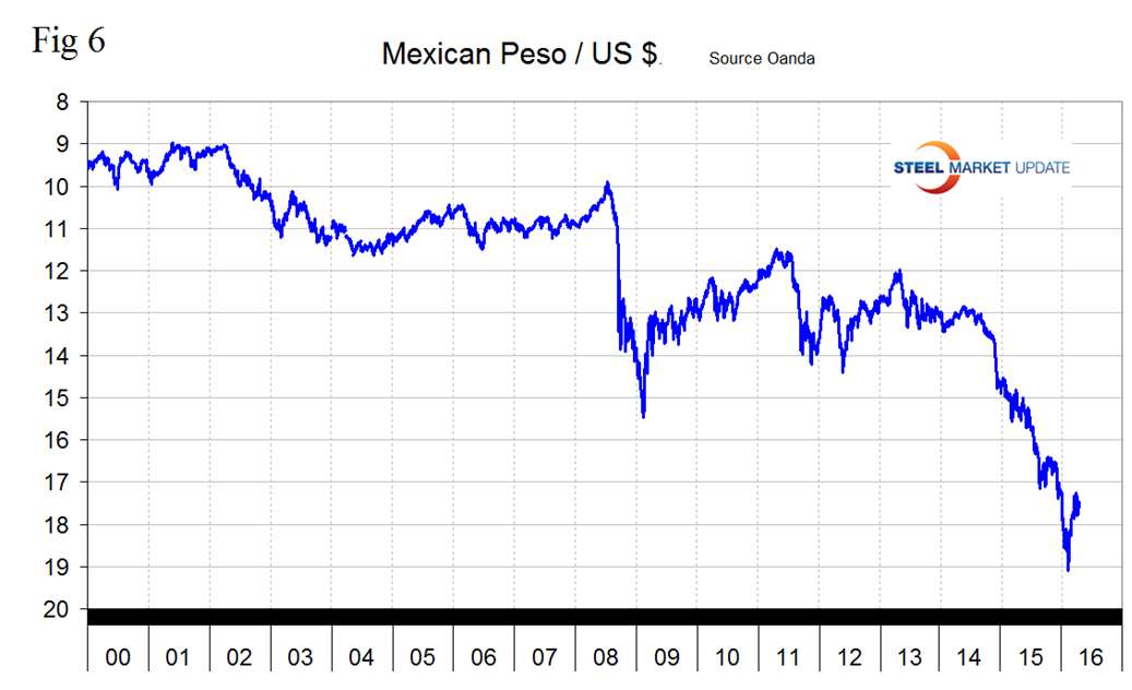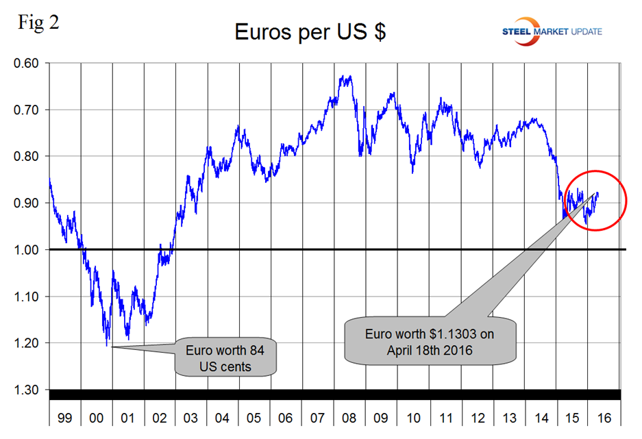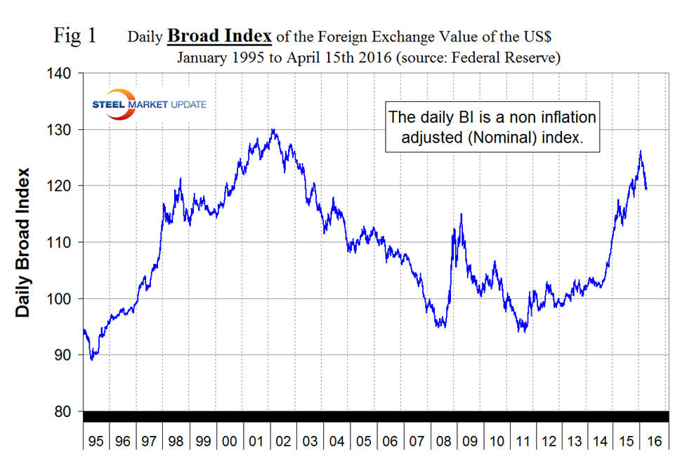 We regard strengthening of the US Dollar as negative and weakening as positive because the effect on net imports. An estimated 25 percent of the U.S. economy had some involvement in international trade therefore currency swings can have a large effects on the economy in general and of the steel industry in particular. In our January 25th update the dollar strengthened against 15 of the 16 currencies under consideration at the 3 month level as traders increased their dollar positions to obtain a better return on their assets. In our February 21st update the $ strengthened against 14 of 16 at the 3 month level and in this April 19th update the $ the dollar did a complete reversal and weakened against 14 of the 16 steel and raw materials trading currencies. In effect the “green” has moved across our table from being predominant at the 7 day level on December 25th to the 1 month level on February 21st and to the 3 month level on April 18th. It looks as though currency traders over bought the dollar and then decided to reduce their positions based on the Fed’s dovish projections for rate increases in the balance of 2016. Looking at the 7 day level in this latest data the dollar is still weakening against 10 of the 16 steel trading currencies meaning that the trend is still ongoing. Figure 1 suggests that this recent weakening is a fairly significant move in a historical context.