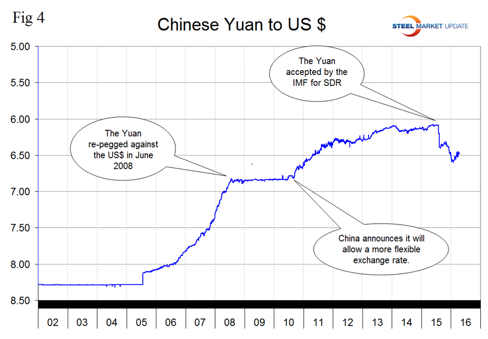 Figure 4 shows the history of the Yuan against the US $ since January 2002.